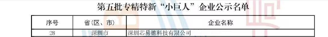 2023年7月14日,根據(jù)中華人民共和國(guó)工業(yè)和信息化部下發(fā)的《關(guān)于深圳市第五批專精特新“小巨人”企業(yè)名單的公示》,深圳芯易德科技有限公司被認(rèn)定為第五批國(guó)家級(jí)專精特新“小巨人”企業(yè)。