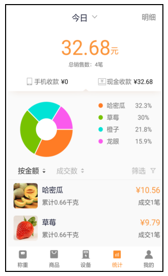 ◆ 銷(xiāo)售數(shù)據(jù)統(tǒng)計(jì):無(wú)論是在手機(jī)端收銀,還是在秤端收銀,都可以統(tǒng)計(jì)銷(xiāo)售情況,并將數(shù)據(jù)保存在云端,隨時(shí)隨地可以查看。
