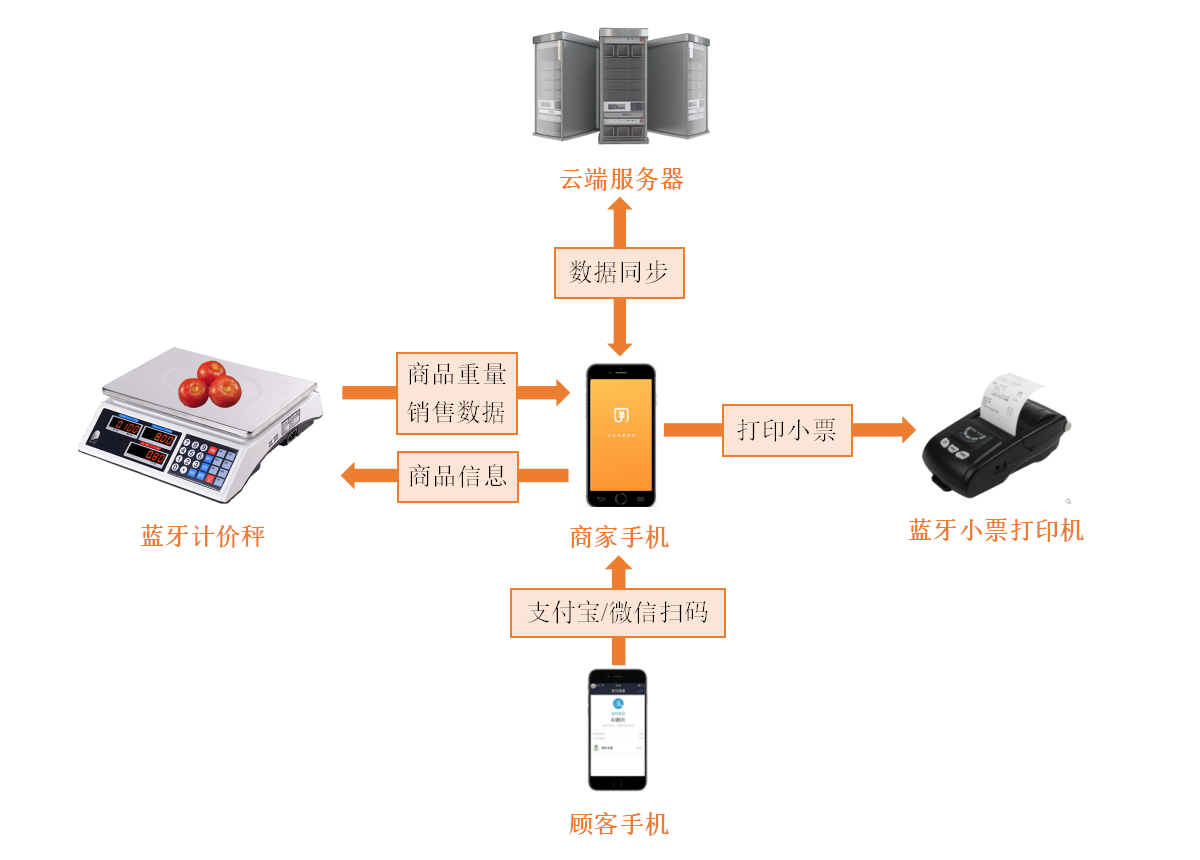 該方案使用藍(lán)牙連接方式,以手機(jī)作為平臺(tái),利用芯易德開(kāi)發(fā)的“銀秤通”APP將商用秤連接到互聯(lián)網(wǎng),實(shí)現(xiàn)移動(dòng)支付收款、商品管理、銷(xiāo)售數(shù)據(jù)統(tǒng)計(jì)、小票打印等功能。